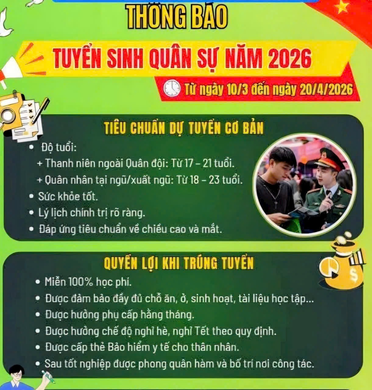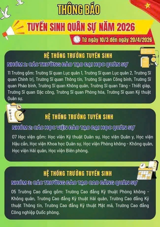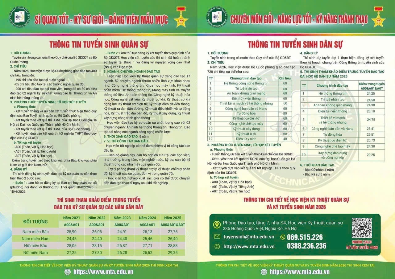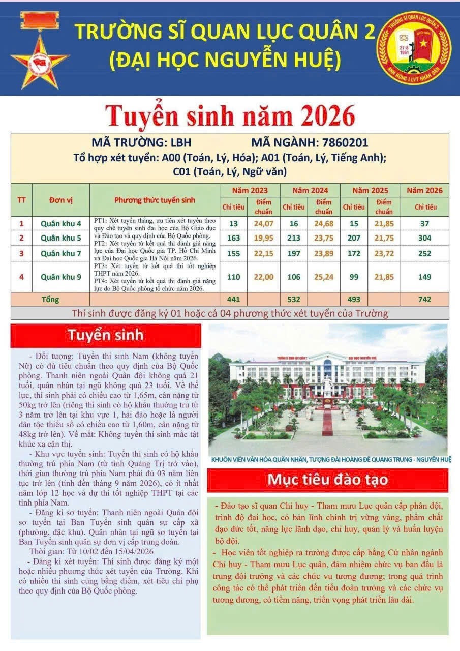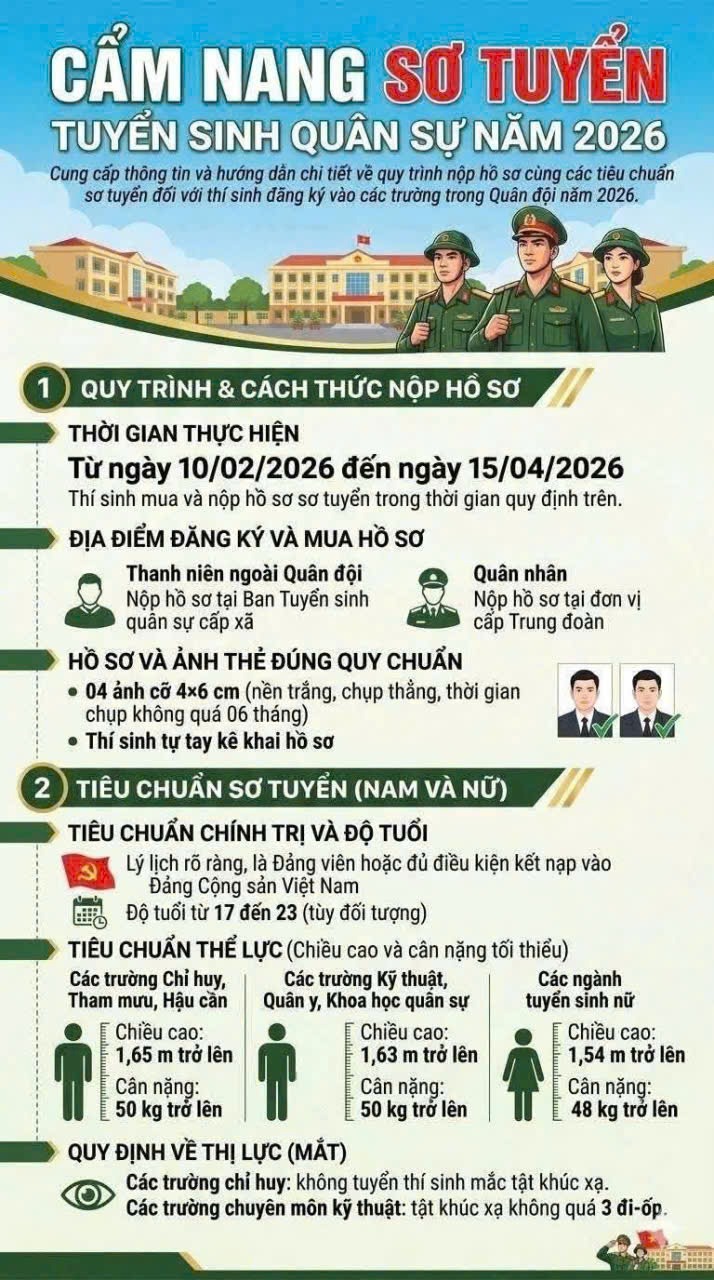 Tại buổi tuyên truyền, đại diện Ban Tuyển sinh quân sự đã trực tiếp giới thiệu những thông tin cơ bản về công tác tuyển sinh năm 2026. Theo đó, thời gian đăng ký dự tuyển dự kiến từ ngày 10/3 đến ngày 20/4/2026. Các tiêu chuẩn dự tuyển được phổ biến cụ thể như: độ tuổi theo quy định; có sức khỏe tốt; lý lịch chính trị rõ ràng; đáp ứng các tiêu chí về chiều cao, thị lực và các điều kiện khác của Bộ Quốc phòng.