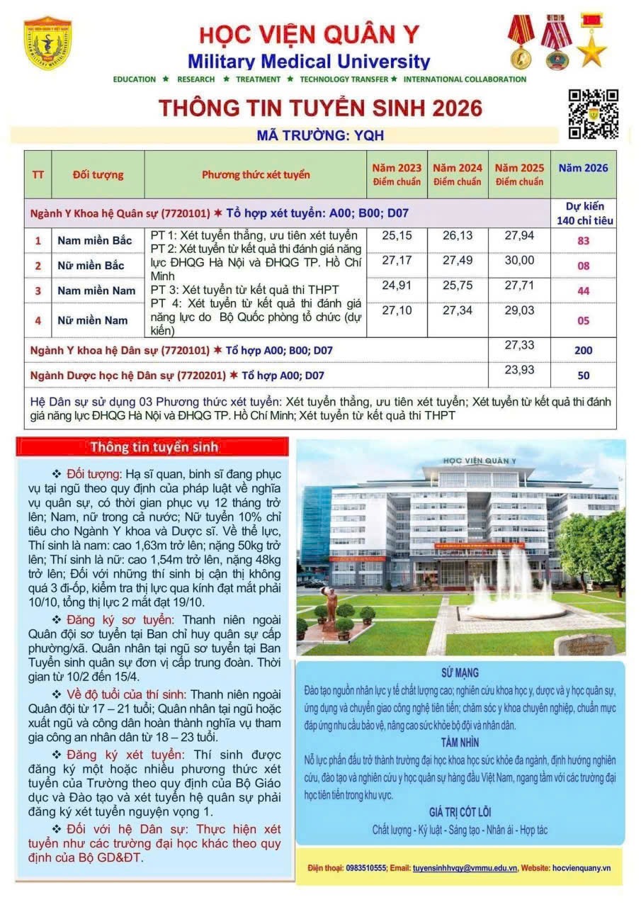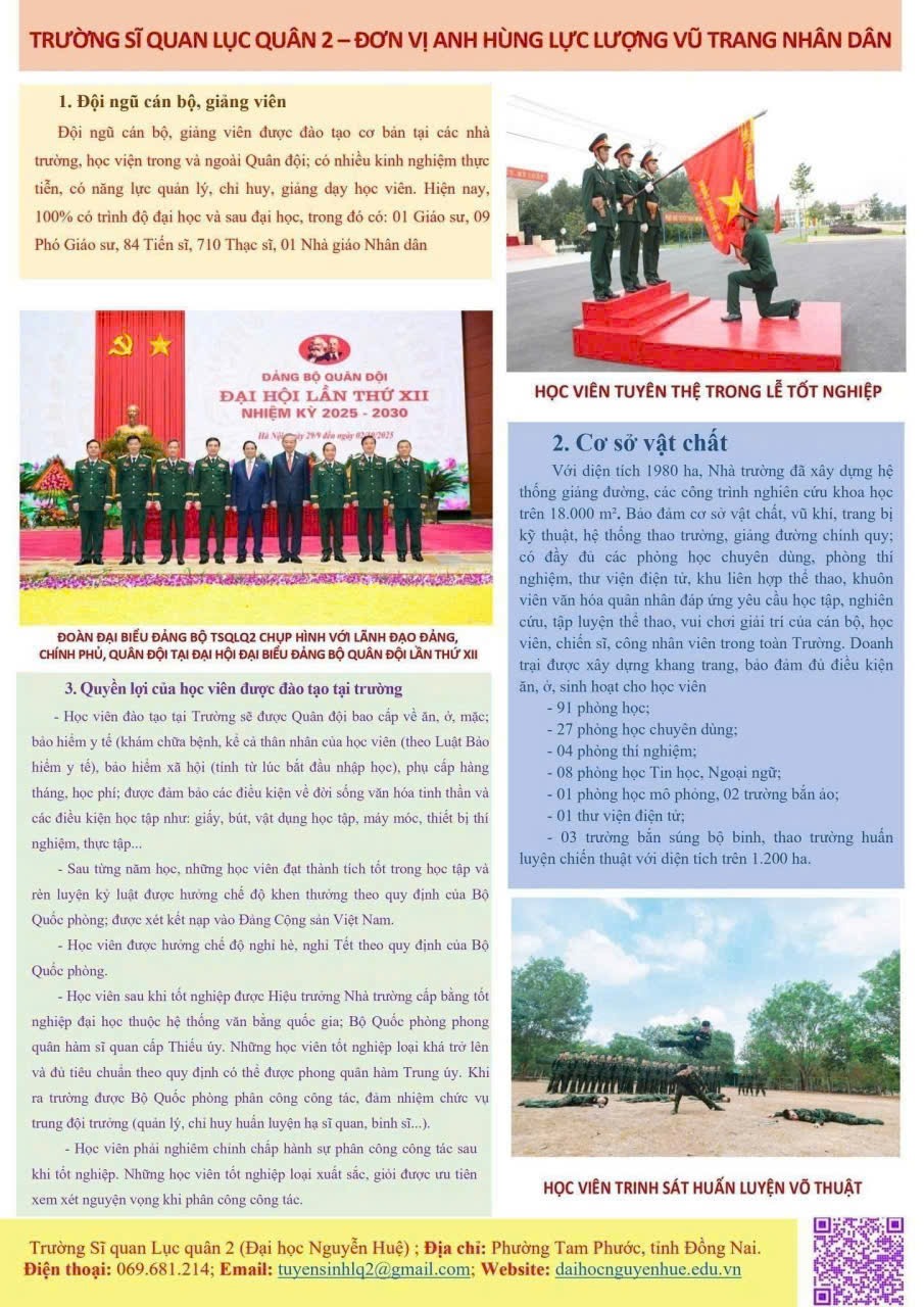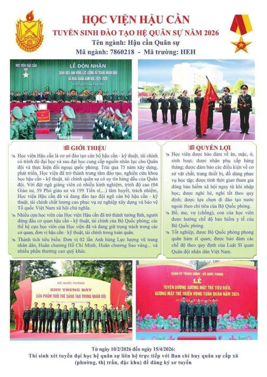 Bên cạnh đó, học sinh được cung cấp đầy đủ thông tin về quyền lợi khi trúng tuyển vào các học viện, nhà trường trong Quân đội như: được miễn 100% học phí; được bảo đảm ăn, ở, sinh hoạt và học tập; được hưởng phụ cấp hàng tháng; được hưởng các chế độ nghỉ theo quy định; được cấp bảo hiểm y tế cho thân nhân. Sau khi tốt nghiệp, học viên được phong quân hàm và bố trí công tác trong Quân đội.